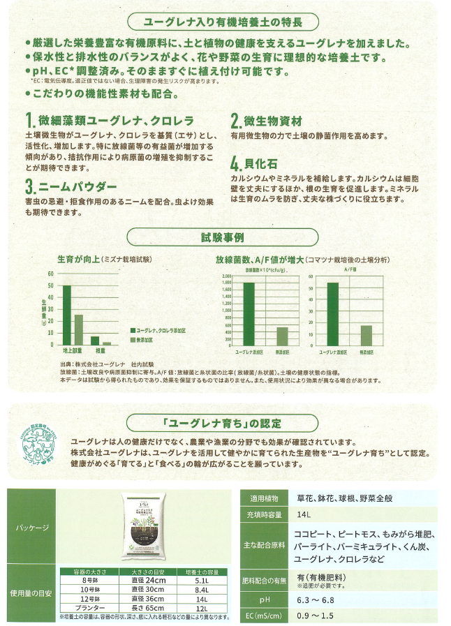 土と植物を健康にするユーグレナ(ミドリムシ)と栄養がたっぷり入った有機原料(ココピートやピートモスなど)を使用し、花や野菜の生育に最適な環境を作る培養土です。