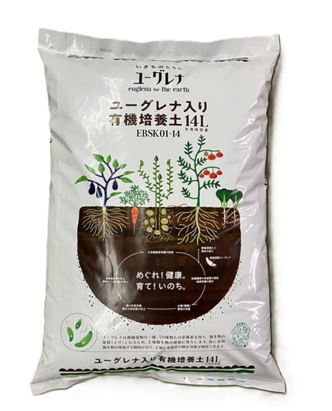 土と植物を健康にするユーグレナ(ミドリムシ)と栄養がたっぷり入った有機原料(ココピートやピートモスなど)を使用し、花や野菜の生育に最適な環境を作る培養土です。